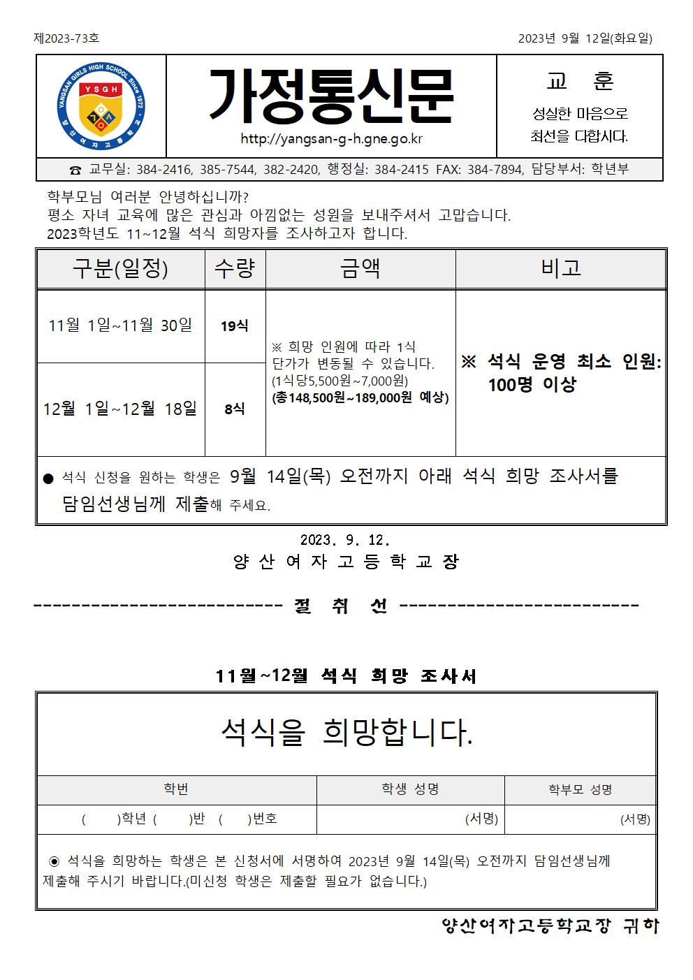 2023학년도 11월-12월 2차 석식 도시락 희망 조사