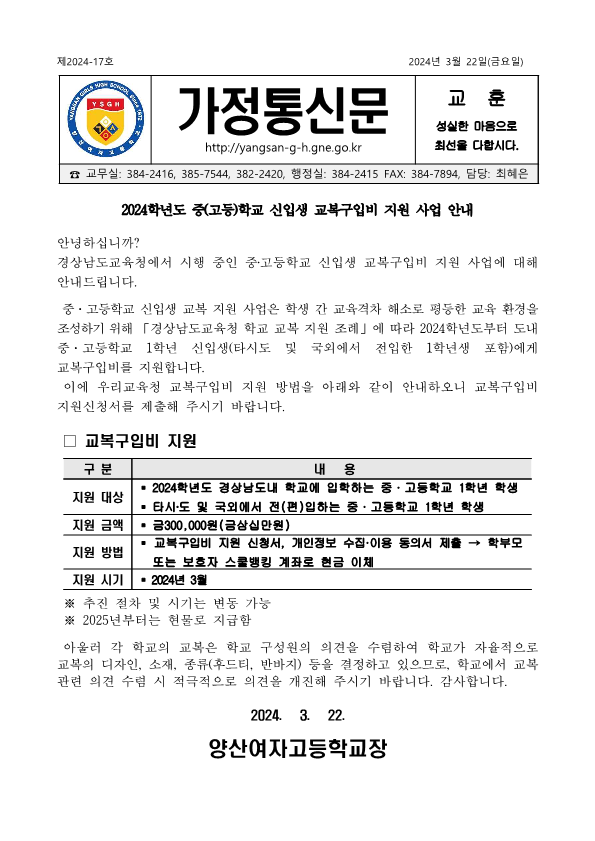 2024학년도 중(고등)학교 신입생 교복구입비 지원 사업 안내