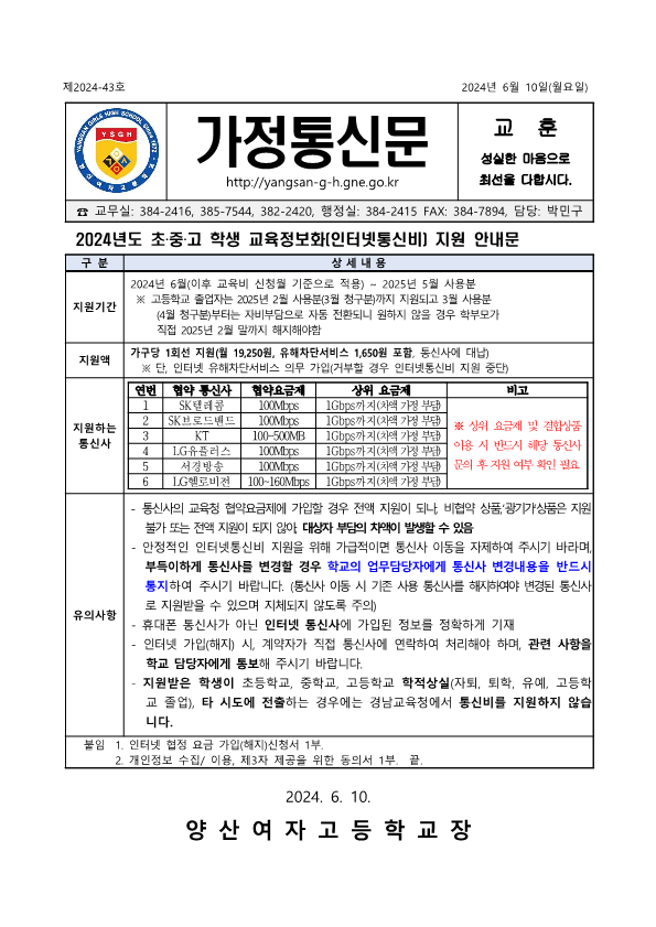 인터넷 통신비 대상자에게 발행된 안내문입니다.