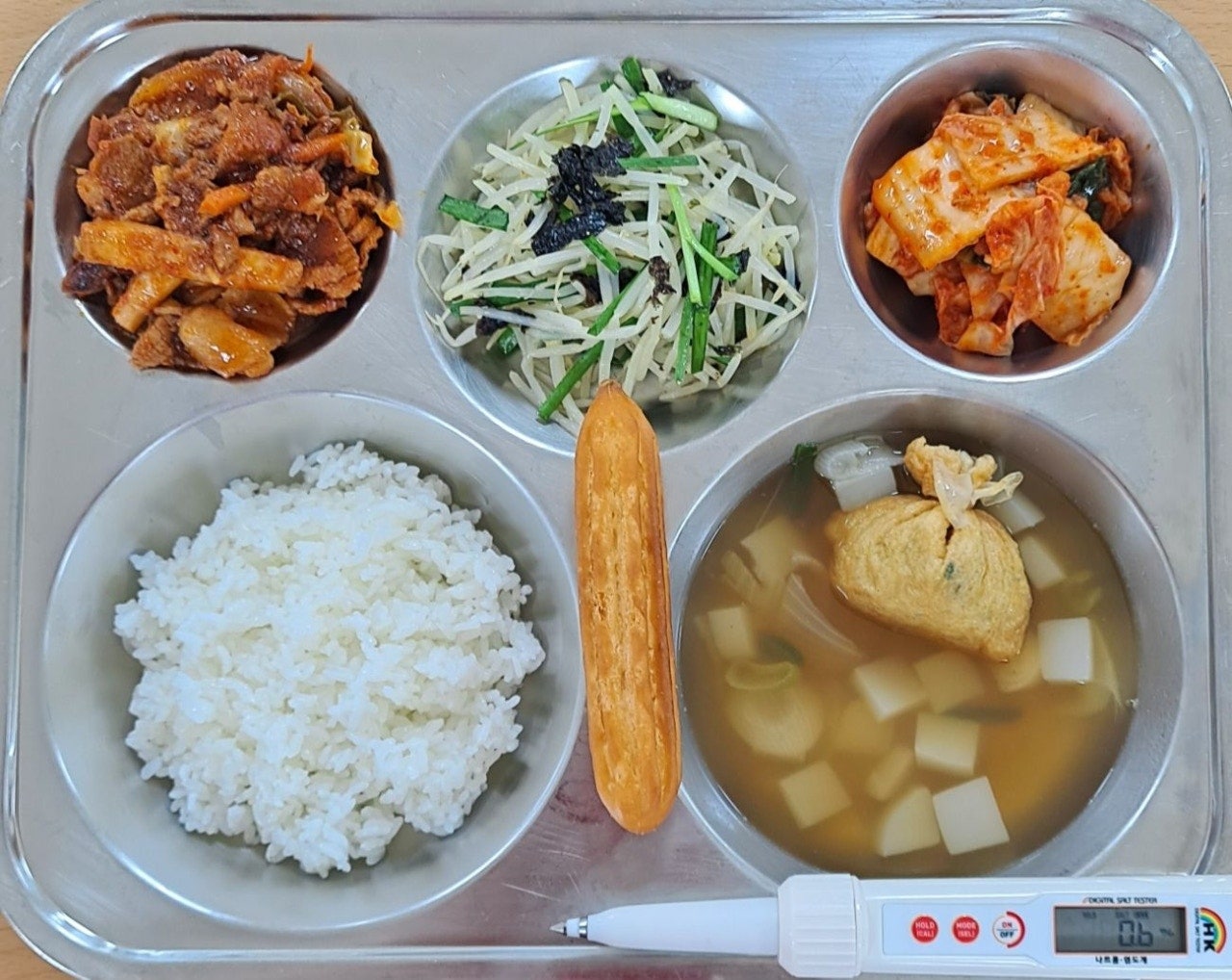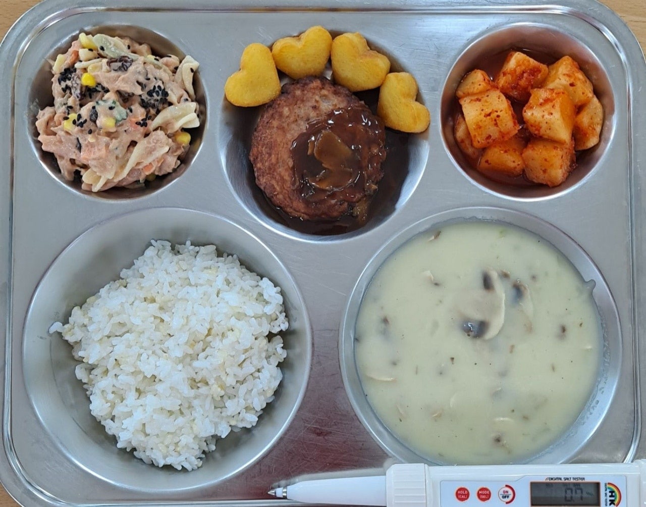 *중식 현미밥 양송이스프(2.5.6.16) 함박스테이크/하트감자(1.2.5.6.10.12.13.15.16) 푸실리참치샐럿(1.5.6.12.13.16.18) 깍두기(9) * 에너지/단백질/칼슘/철 749.5/22.0/71.3/2.0