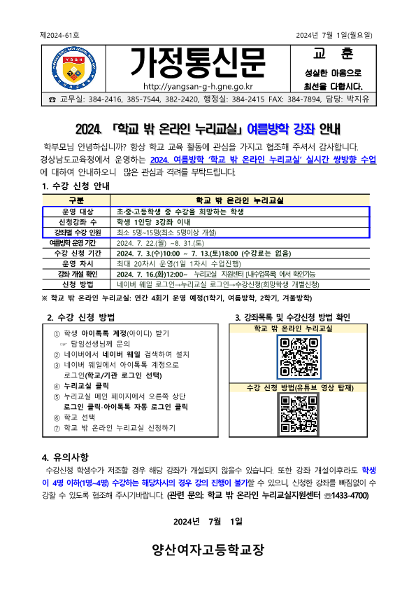 [2024-61]2024. 학교 밖 온라인 누리교실 여름방학 강좌 안내 가정통신문.hwp