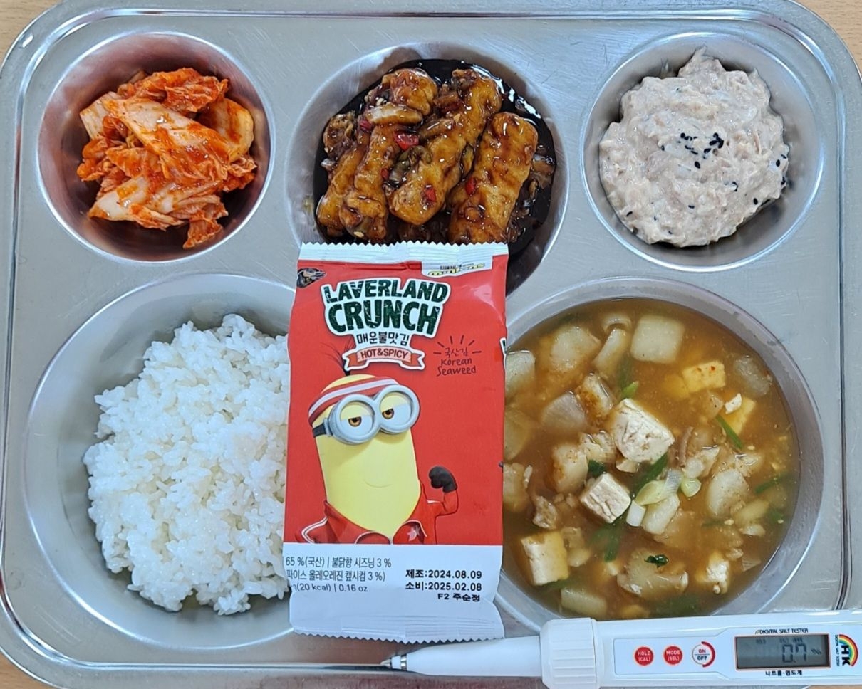 *석식 찹쌀밥 동태찌개(5.6.9) 맛쵸킹탕수육(1.5.6.10.13) 참치마요샐럿(1.5.16.18)/불닭맛김 배추김치(9) * 에너지/단백질/칼슘/철 703.2/26.3/100.1/8.9