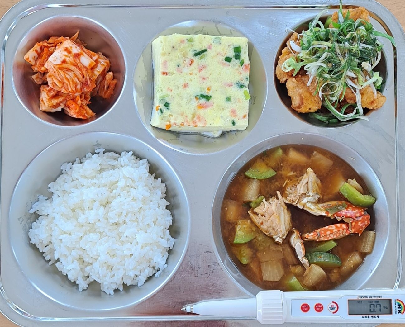 *중식 찹쌀밥 꽃게탕(5.6.8.9) 파닭치킨(1.5.6.15) 계란야채찜(1.9) 배추김치(9) * 에너지/단백질/칼슘/철 736.1/41.2/182.8/3.8
