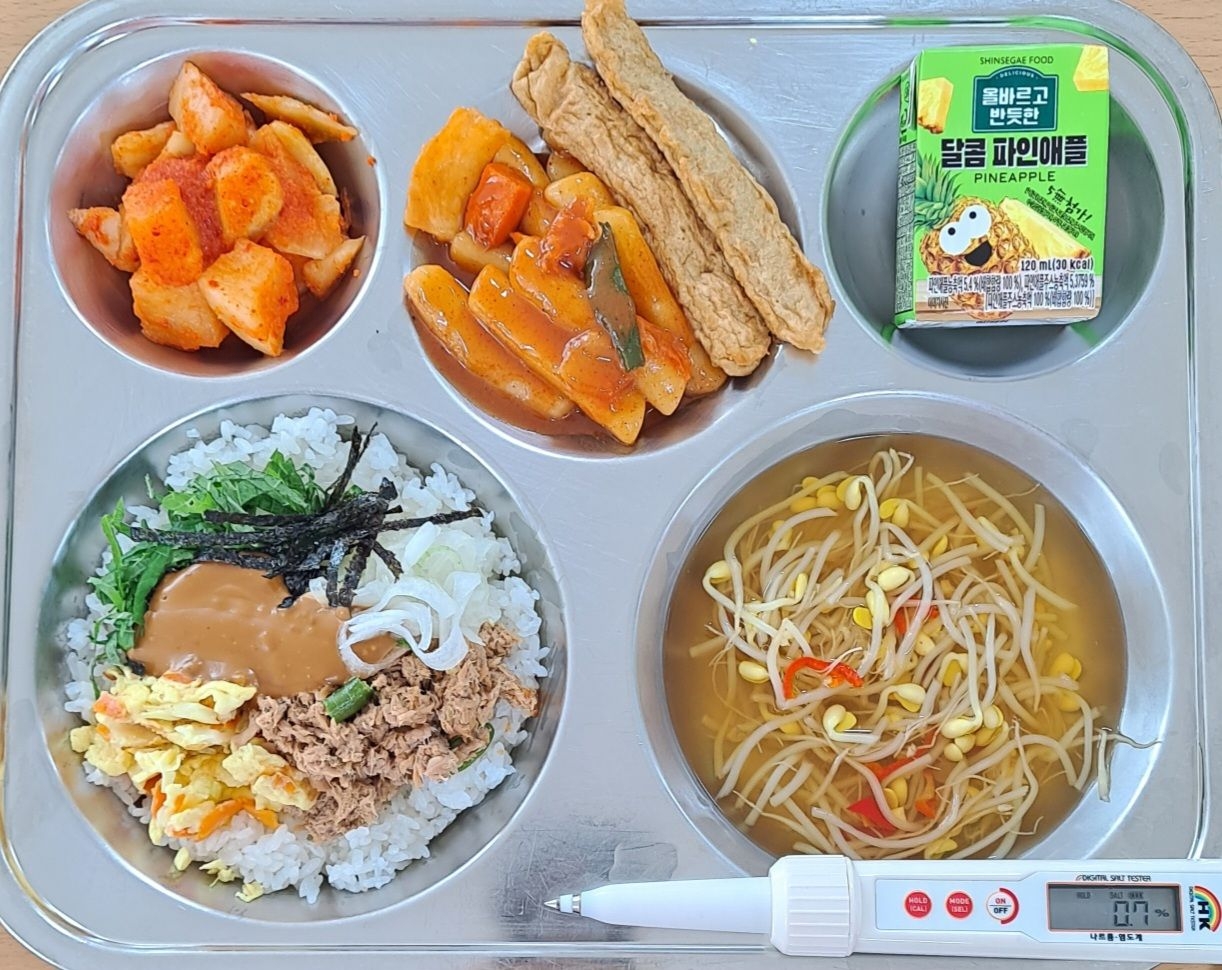 참치마요덮밥(1.5.6.13.16.18)홍초콩나물국(5.9)떡볶이/튀김오뎅(1.5.6.13)깍두기(9)미니파인애플주스(13)* 에너지/단백질/칼슘/철724.9/30.8/164.9/2.7