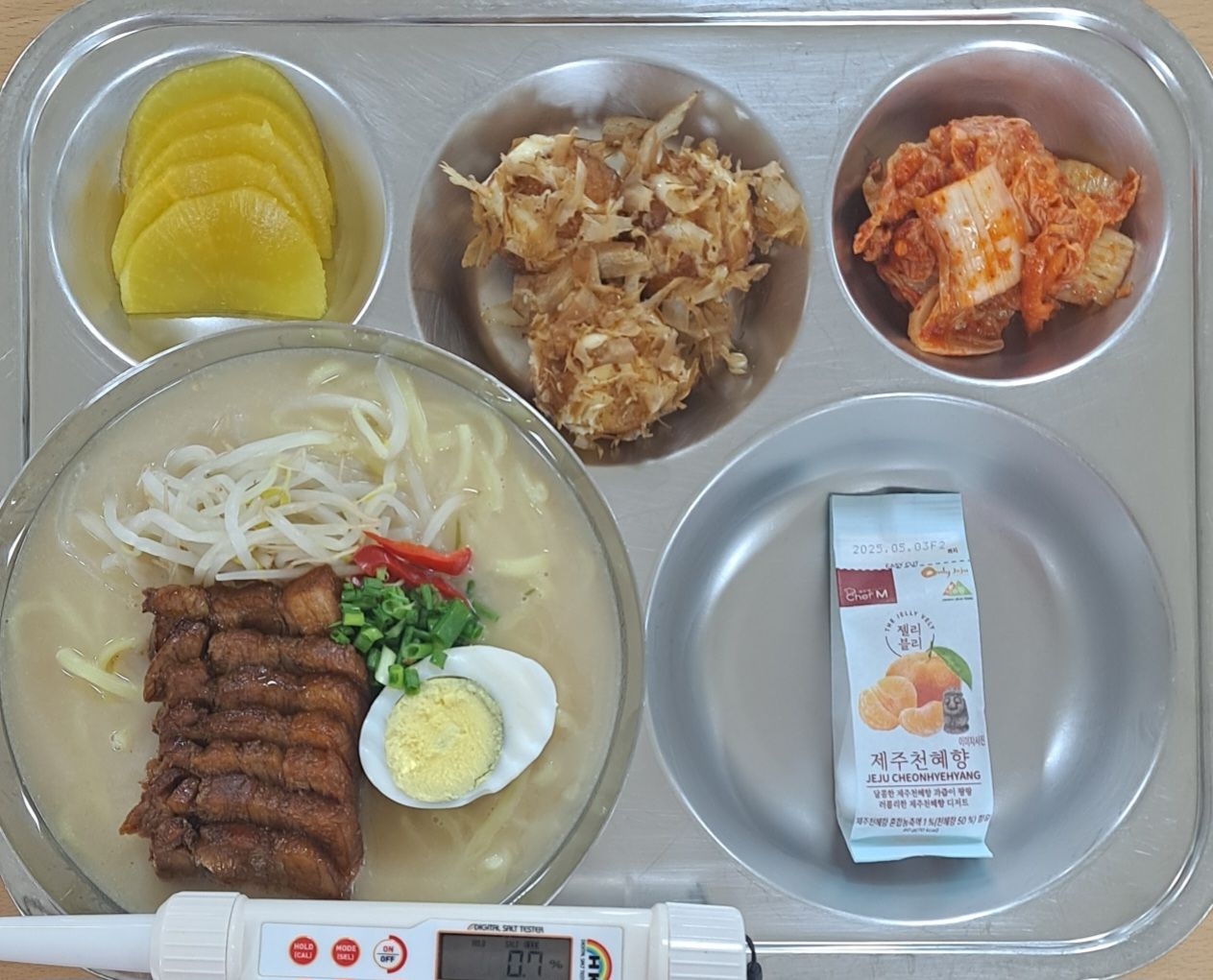 돈코츠라멘(1.2.5.6.10.13.15.16)타코야끼(1.2.5.6)단무지배추김치(9)천혜향젤리* 에너지/단백질/칼슘/철733.5/18.1/243.4/3.0