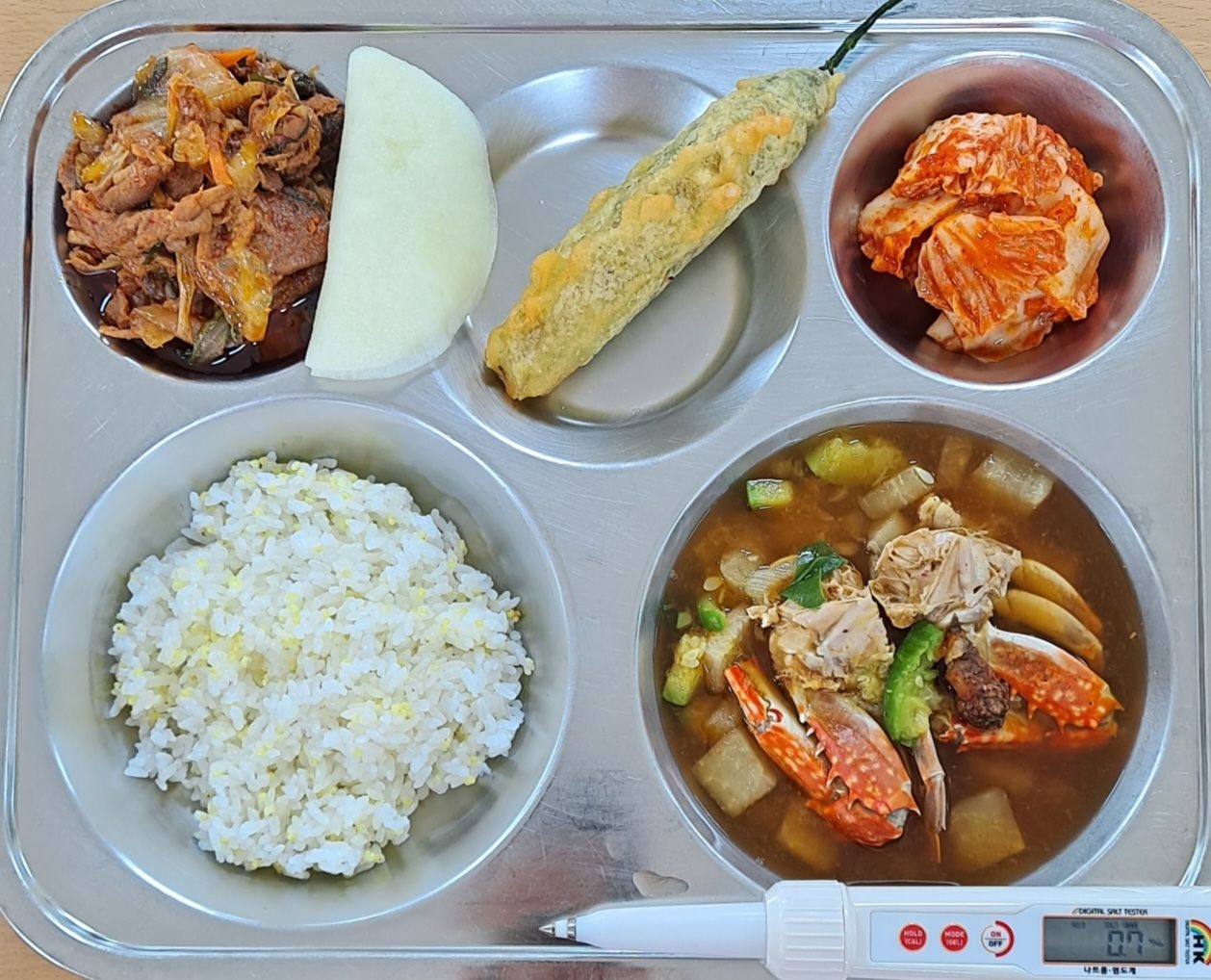 찰기장밥꽃게탕(5.6.8.9)오리불고기(13)/무쌈고추튀김(1.5.6.10.18)배추김치(9)* 에너지/단백질/칼슘/철735.7/27.0/156.1/2.7
