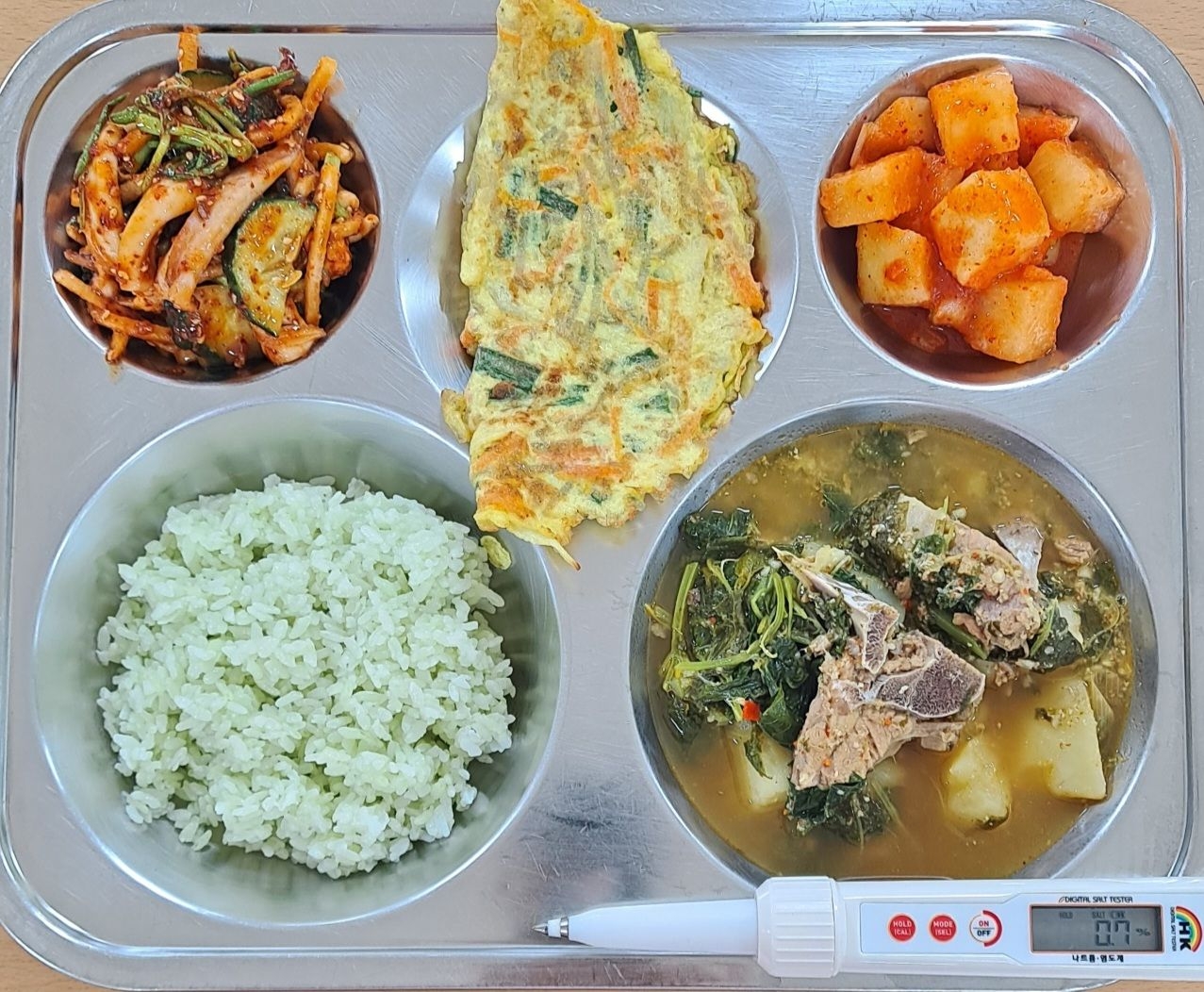 클로렐라쌀밥등뼈감자탕(5.6.10)계란만두(1)오징어초무침(5.6.13.17)깍두기(9)* 에너지/단백질/칼슘/철716.9/38.3/170.5/3.4