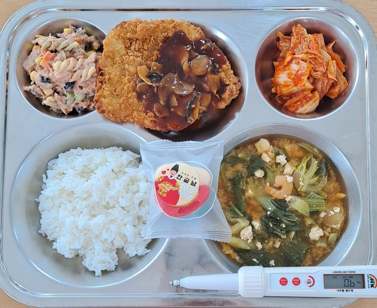 찹쌀밥연두부청경채새우국(5.6.9)돈가스(1.2.5.6.10.12.13.16.18)푸실리참치샐럿(1.5.6.12.13.16.18)배추김치(9)요거트마카롱(1.2.6)* 에너지/단백질/칼슘/철742.2/21.5/106.6/2.2