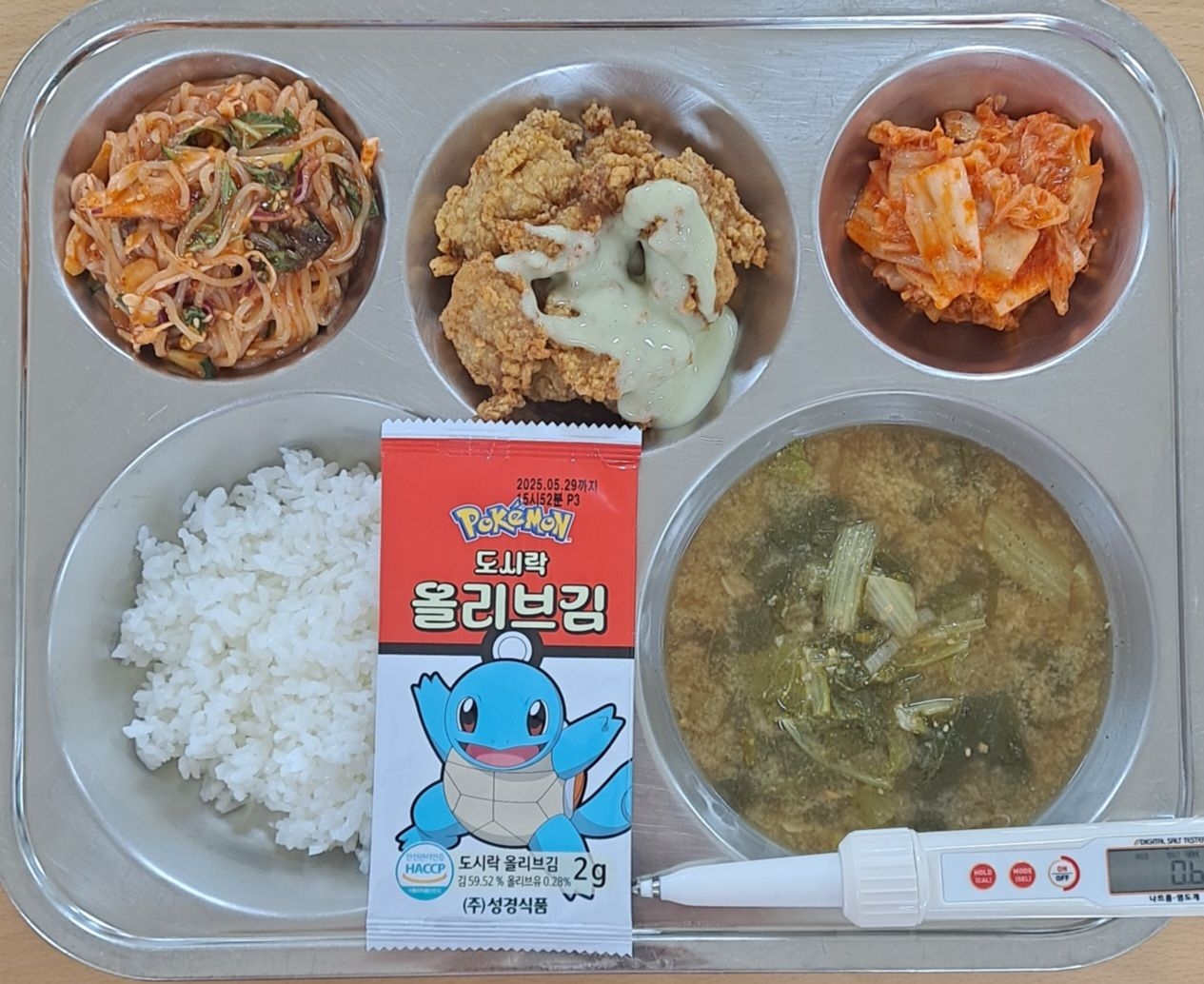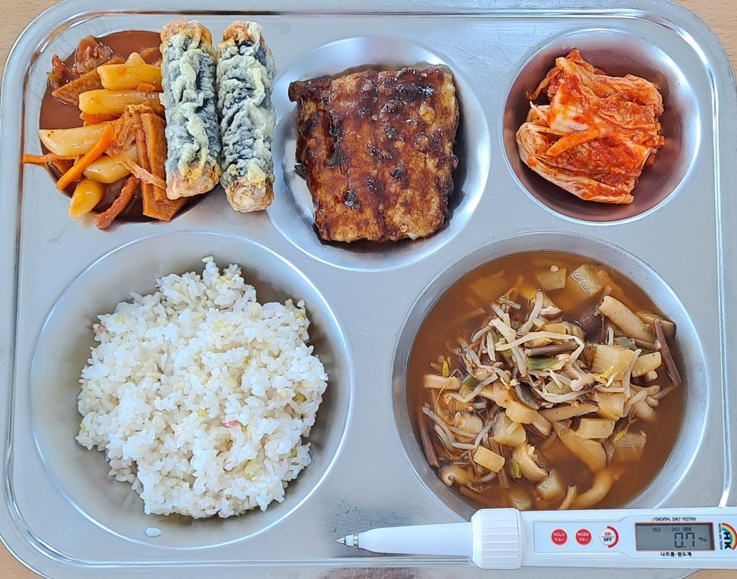 오색발아현미밥채식육개장(5.6)삼치데리야끼구이(5.6.13)떡볶이/불닭맛김말이(1.5.6.13.16)배추김치(9)* 에너지/단백질/칼슘/철721.9/20.9/97.6/10.9