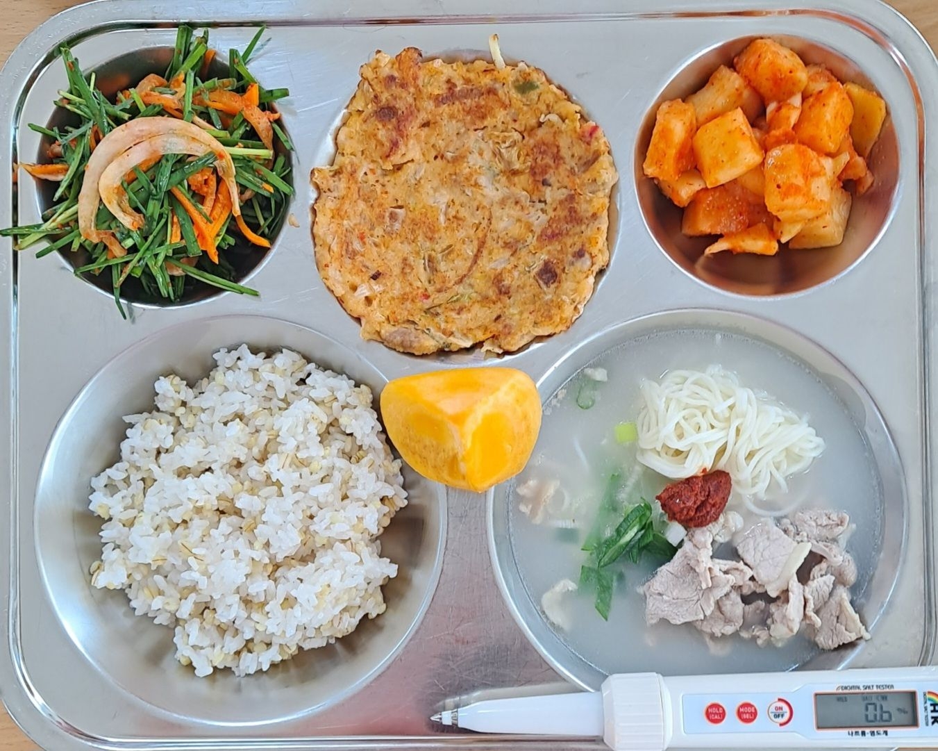 보리밥돼지국밥/소면(5.6.9.10)녹두빈대떡(6.9.10)부추생채(13)깍두기(9)