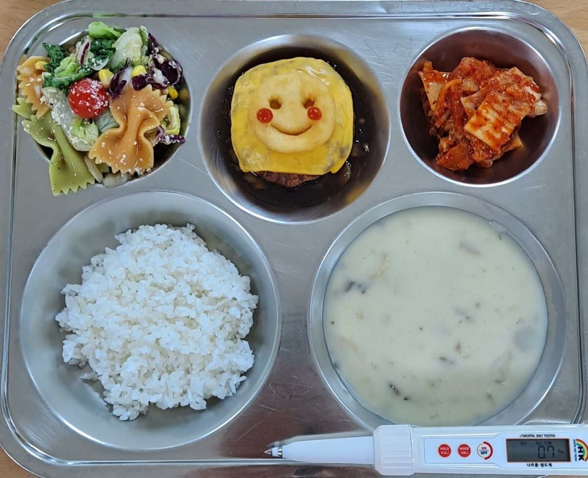 찹쌀밥양송이스프(2.5.6.16)스마일함박(1.2.5.6.10.12.13.15.16)파스타샐럿(1.2.5.6.12.13)배추김치(9)* 에너지/단백질/칼슘/철723.3/20.3/162.3/1.9