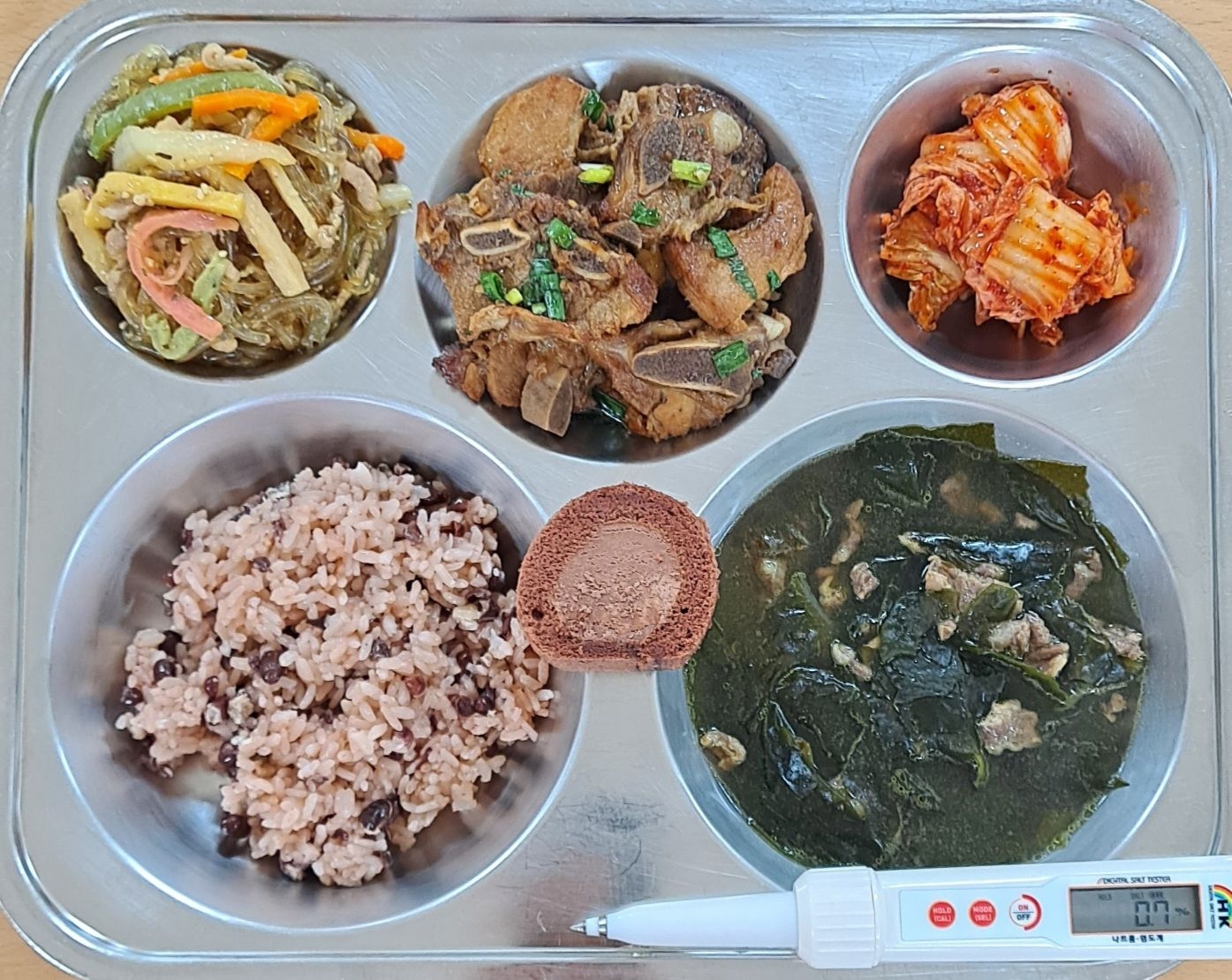 *중식 팥찰밥 쇠고기미역국(5.6.16) 돼지LA갈비구이(5.6.10.13) 어묵잡채(1.5.6.10.13) 배추김치(9) 초코롤케이크(1.2.5.6) * 에너지/단백질/칼슘/철 737.6/34.5/107.1/3.8