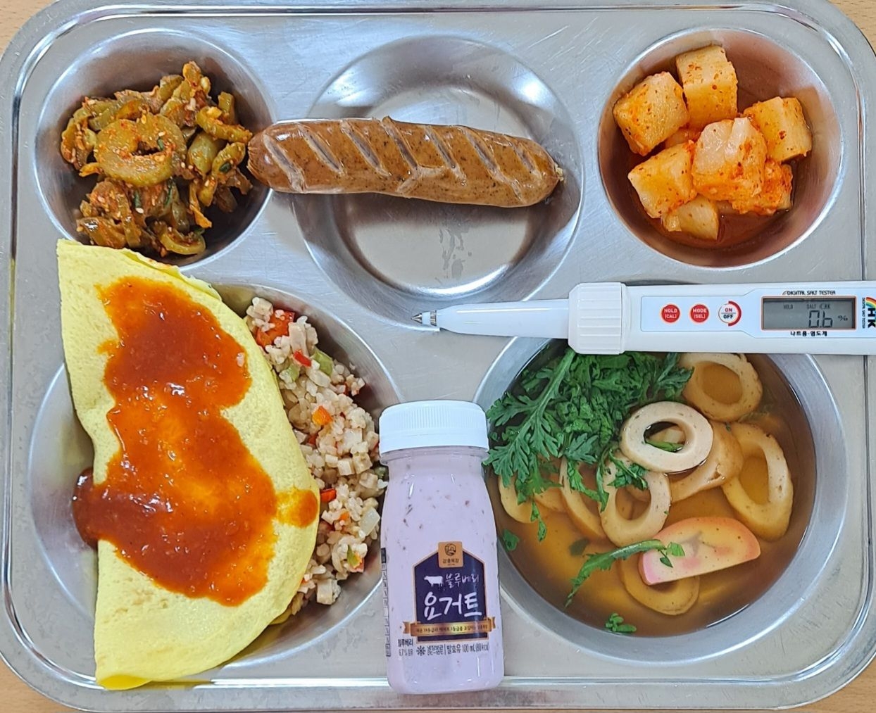 *석식 오므라이스(1.2.5.6.10.12.13.15.16.18) 가쓰오장국(1.2.5.6.7.9.13.18) 소시지구이(2.5.6.10.12.15.16) 오이지무침(13) 깍두기(9) 블루베리요거트(2) * 에너지/단백질/칼슘/철 739.1/31.6/225.0/4.4