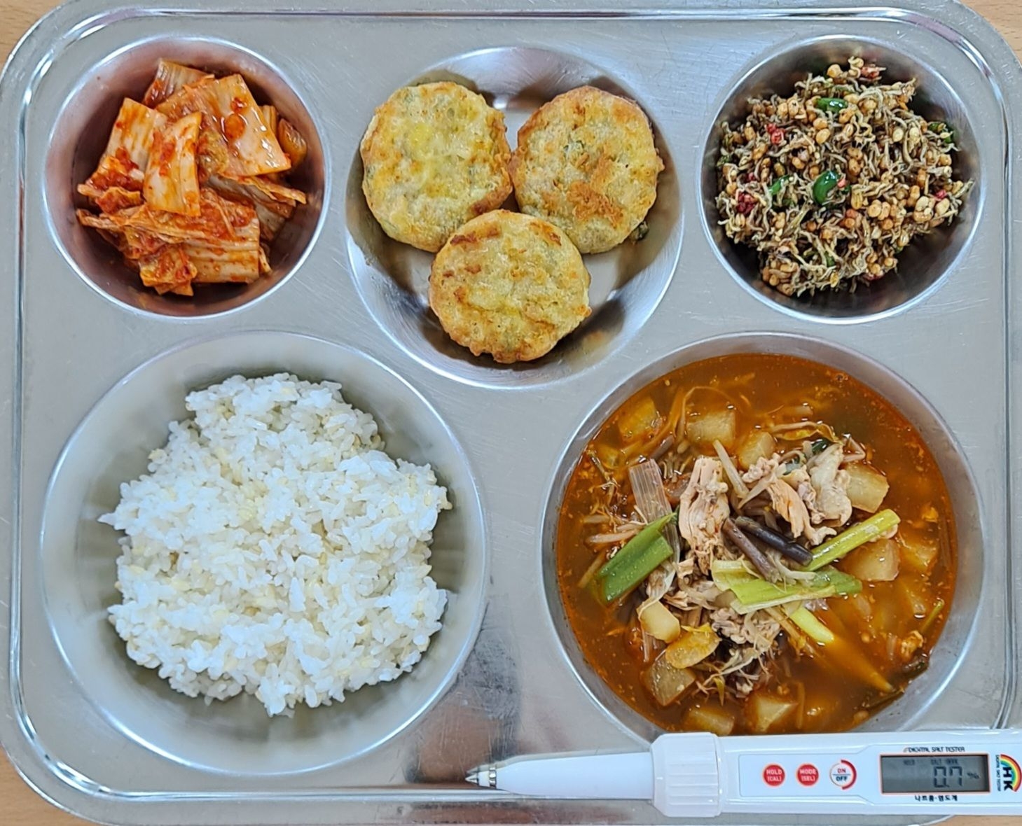 현미밥닭개장(5.6.15)동그랑땡전(1.2.5.6.10.15.16)뮤즐리멸치볶음(5.6)배추김치(9)* 에너지/단백질/칼슘/철721.4/25.5/157.7/3.0