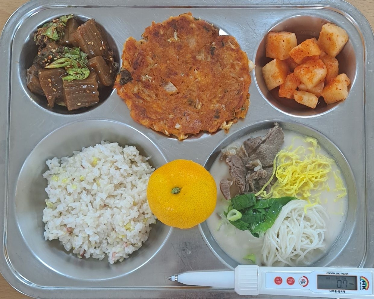 오색발아현미밥설렁탕/소면(1.5.6.16)김치전(5.6.9.16.18)도토리묵상추무침(5.6.13)깍두기(9)