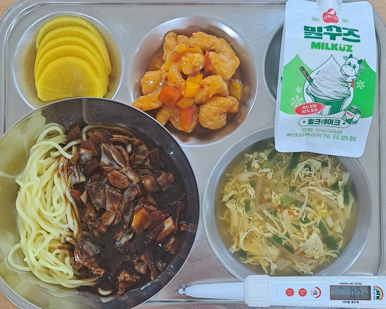 자장면(5.6.10.13.16)크래미계란국(1.5.6.8.9)칠리깐쇼새우(1.5.6.9.12.13)단무지밀크쉐이크(1.2.5)* 에너지/단백질/칼슘/철732.5/27.6/339.3/2.7
