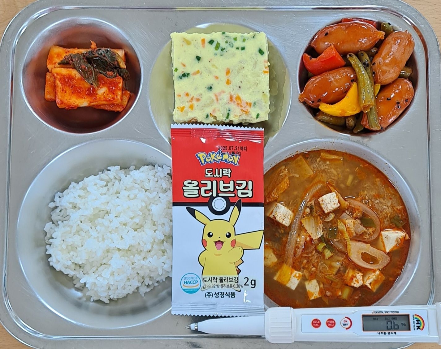 찹쌀밥참치김치찌개(5.9.16.18)비엔나야채볶음(2.5.6.10.12.13.15.16)계란야채찜(1.9)알타리김치(9)