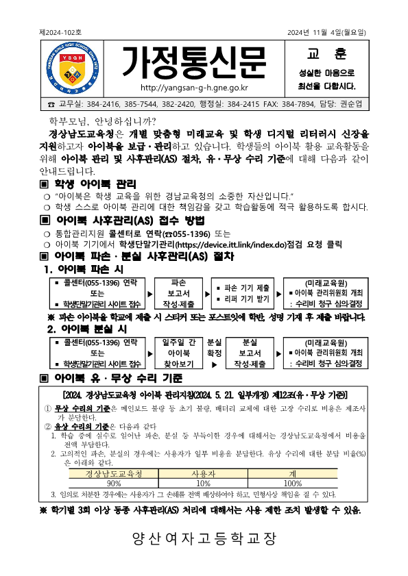 학생 아이북관리 및 사후관리(AS)절차, 유무상 수리 기준 안내