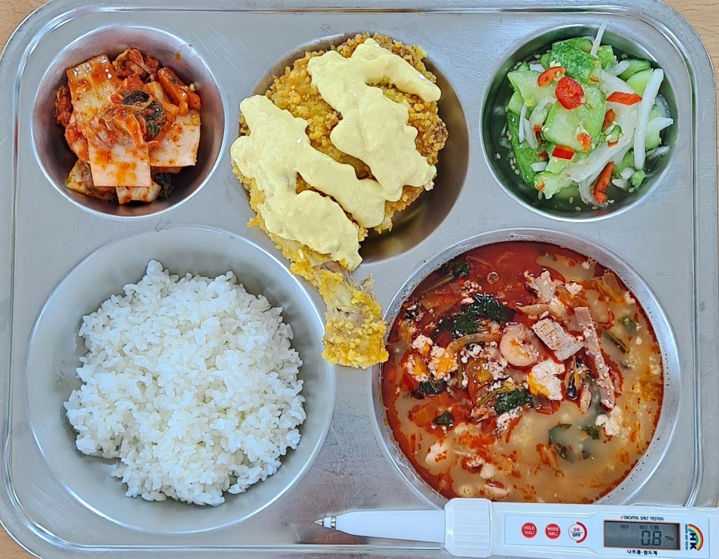 찹쌀밥짬뽕순두부(5.6.9.10.13.17.18)콘크림닭다리구이(15)오이탕탕이(13)배추김치(9)* 에너지/단백질/칼슘/철739.5/59.6/88.4/2.8
