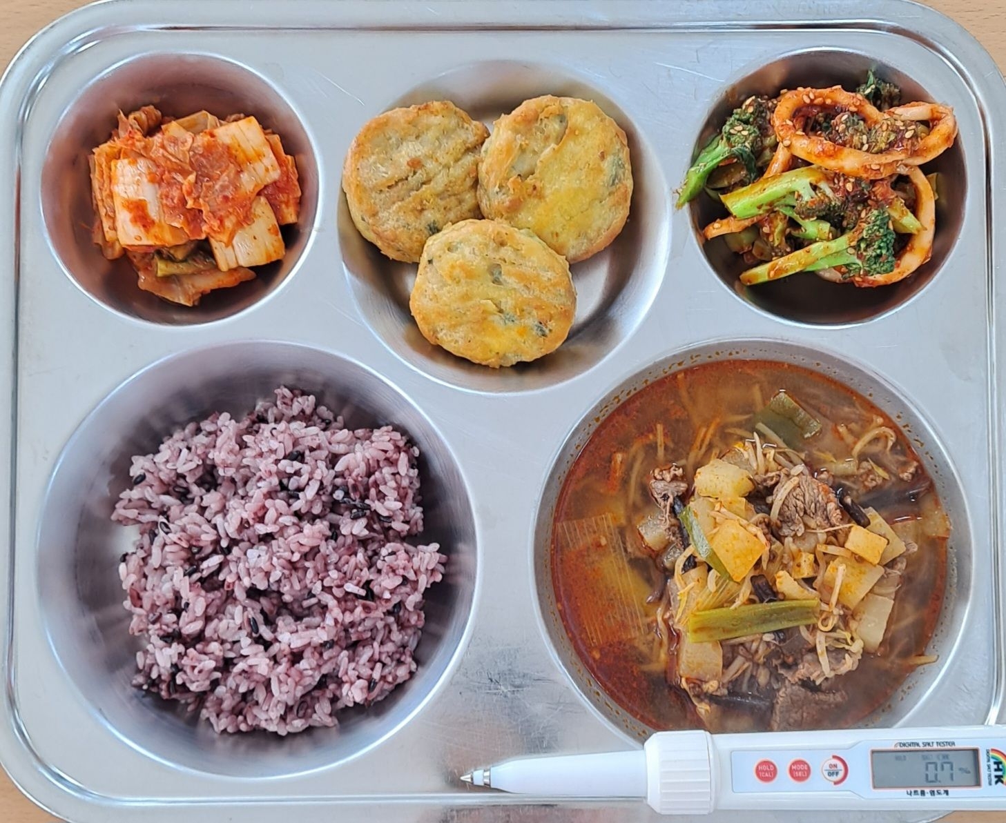 흑미밥육개장(5.6.16)동그랑땡전(1.2.5.6.10.15.16)오징어브로콜리초회(5.6.13.17)배추김치(9)* 에너지/단백질/칼슘/철712.0/29.9/130.7/3.9