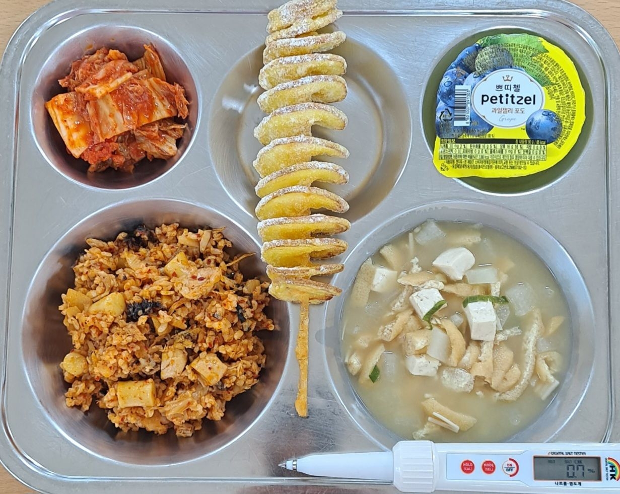 닭갈비야채볶음밥(5.6.9.15.18)유부장국(5.6.9)회오리감자(5.6)배추김치(9)포도푸딩* 에너지/단백질/칼슘/철731.6/22.2/242.9/3.7