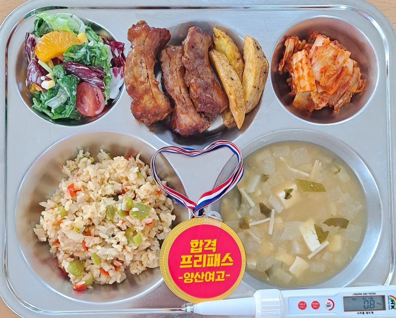 햄야채볶음밥(1.2.5.6.10.13.15.16.18)미소장국(5.6.9)바비큐폭립/웨지감자(5.6.10)만다린샐러드(1.2.5.6.12.13)배추김치(9)금메달초콜릿(2.5)* 에너지/단백질/칼슘/철744.8/29.5/133.2/2.9