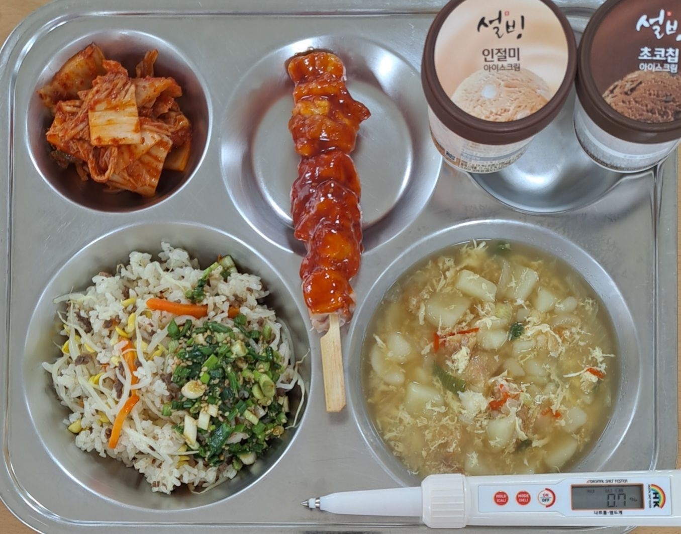콩나물밥/잔파양념장(5.6.16)황태감자국(1.9)닭꼬치(5.6.15)배추김치(9)설빙아이스크림(초코or인절미)(1.2.5)* 에너지/단백질/칼슘/철738.8/32.3/159.8/11.7