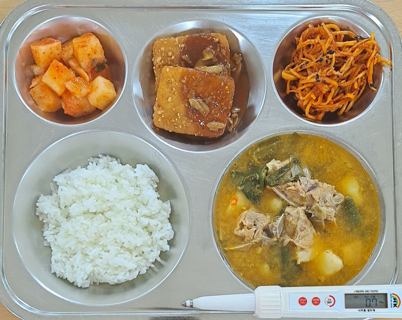 찹쌀밥등뼈감자탕(5.6.10)두부카츠(1.2.5.6.12.13.16.18)일미도라지무침(5.6.13.17)깍두기(9)* 에너지/단백질/칼슘/철745.0/29.2/120.7/1.4