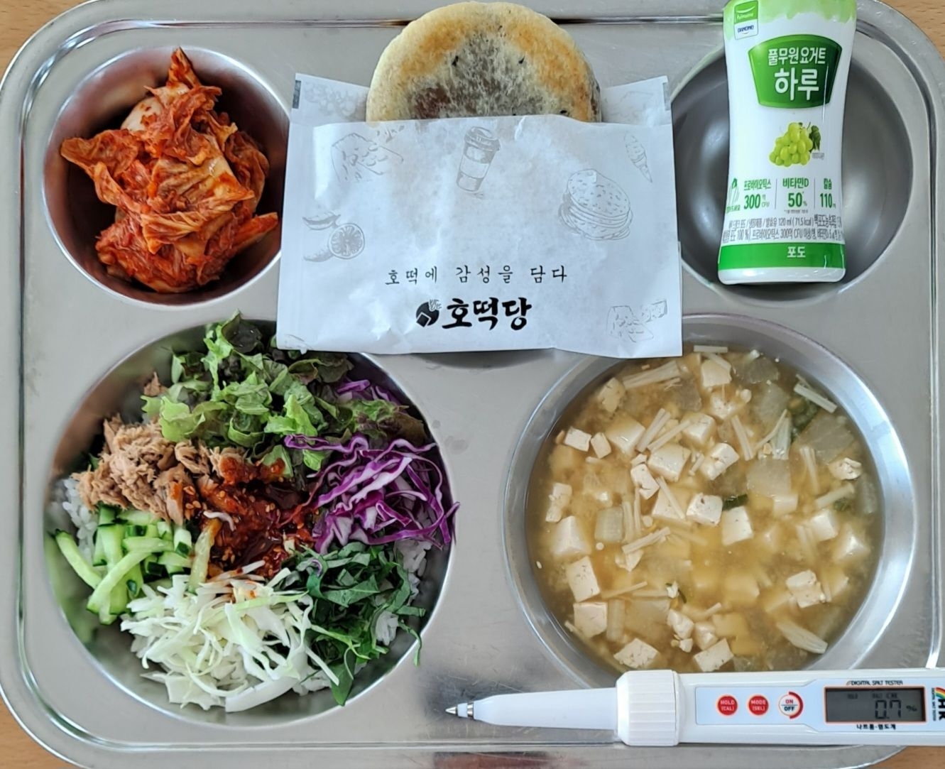 참치야채비빔밥(5.6.13.16.18)두부장국(5.6.9)배추김치(9)꿀호떡(1.2.5.6)마시는요거트(포도)(2)* 에너지/단백질/칼슘/철720.1/19.3/88.9/1.3