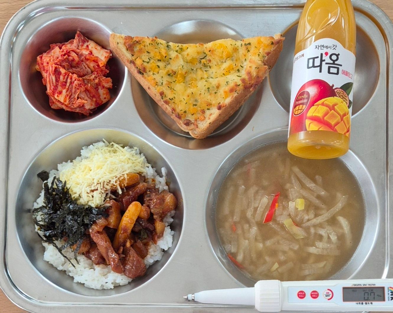 숯불돈육덮밥(2.10)들깨무채국(9)배추김치(9)크로크무슈(1.2.5.6.10)애플망고주스(13)* 에너지/단백질/칼슘/철705.6/31.7/149.4/5.9