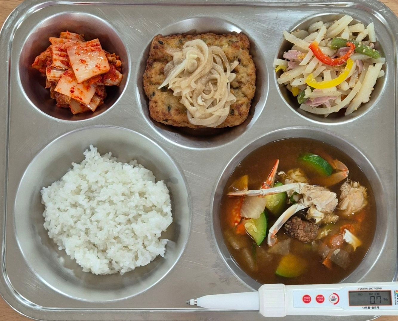 찹쌀밥꽃게탕(5.6.8.9)고기완자/양파지(1.2.5.6.10.13.15.16.18)감자채볶음(10.13)배추김치(9)* 에너지/단백질/칼슘/철738.9/32.6/254.1/2.9