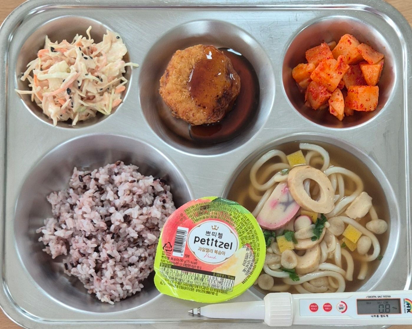 흑미밥미니우동(1.2.5.6.7.9.13.18)볼카츠(1.5.6.10)양배추샐럿(1.5.12)깍두기(9)복숭아푸딩(11)* 에너지/단백질/칼슘/철736.4/15.6/88.6/1.5