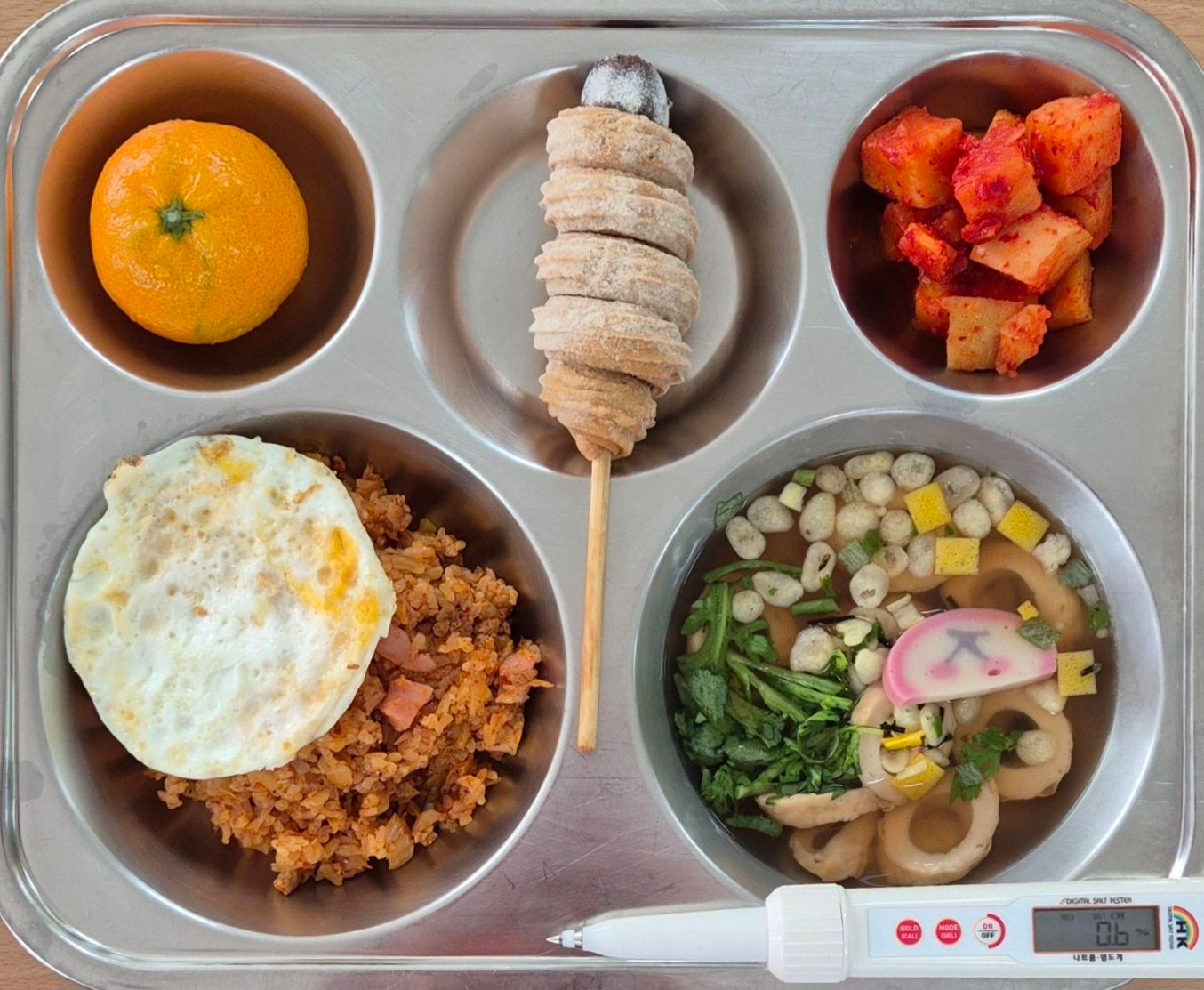 김치볶음밥/계란후라이(1.2.5.6.9.10.15.16)가쓰오장국(1.2.5.6.7.9.13.18)소시지추러스(1.2.5.6.10.16)깍두기(9)귤* 에너지/단백질/칼슘/철731.1/25.1/183.8/2.2