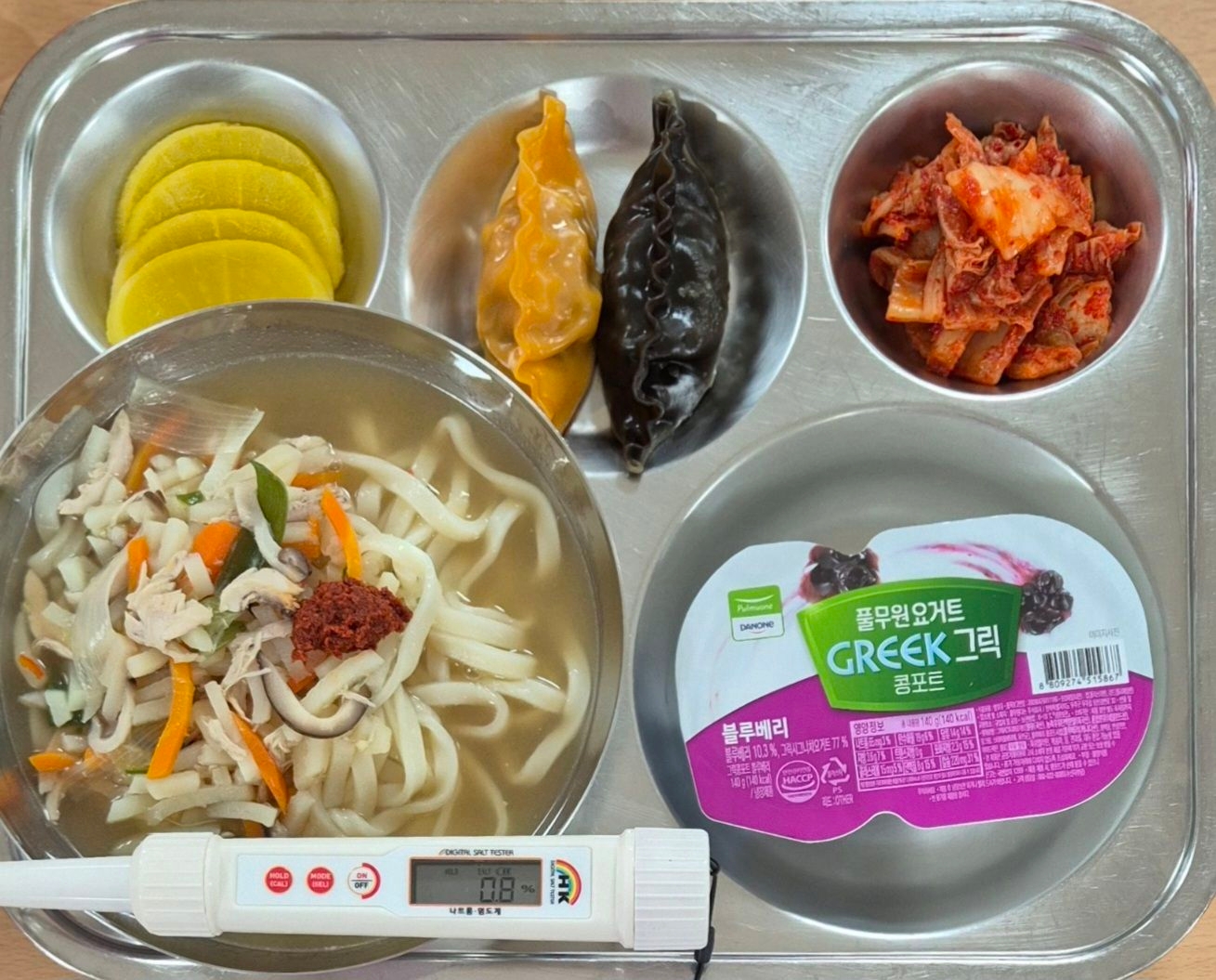 닭칼국수(6.15)짜장만두,짬뽕만두(1.5.6.10.16.18)단무지배추김치(9)블루베리콩포트요거트(2)* 에너지/단백질/칼슘/철725.6/28.5/194.3/2.9