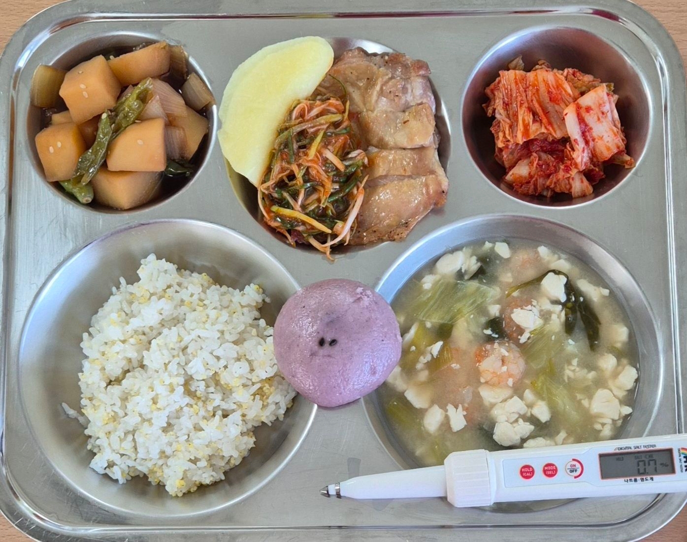찰기장밥연두부청경채새우국(5.6.9)닭보쌈/파채무침/무쌈(15)꽈리고추감자조림(5.6.13)배추김치(9)복분자증편* 에너지/단백질/칼슘/철742.0/33.5/99.4/2.2