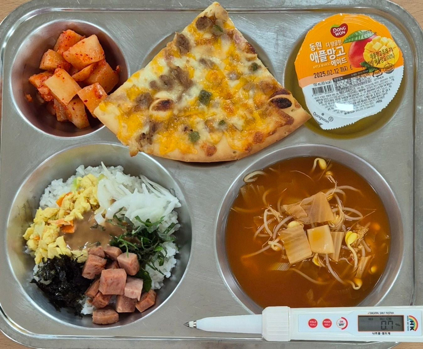스팸마요덮밥(1.2.5.6.10.13.15.16)김치콩나물국(5.9)깍두기(9)불고기피자(1.2.5.6.10.12.13.15.16)애플망고주스(13)* 에너지/단백질/칼슘/철729.5/30.6/299.7/3.1