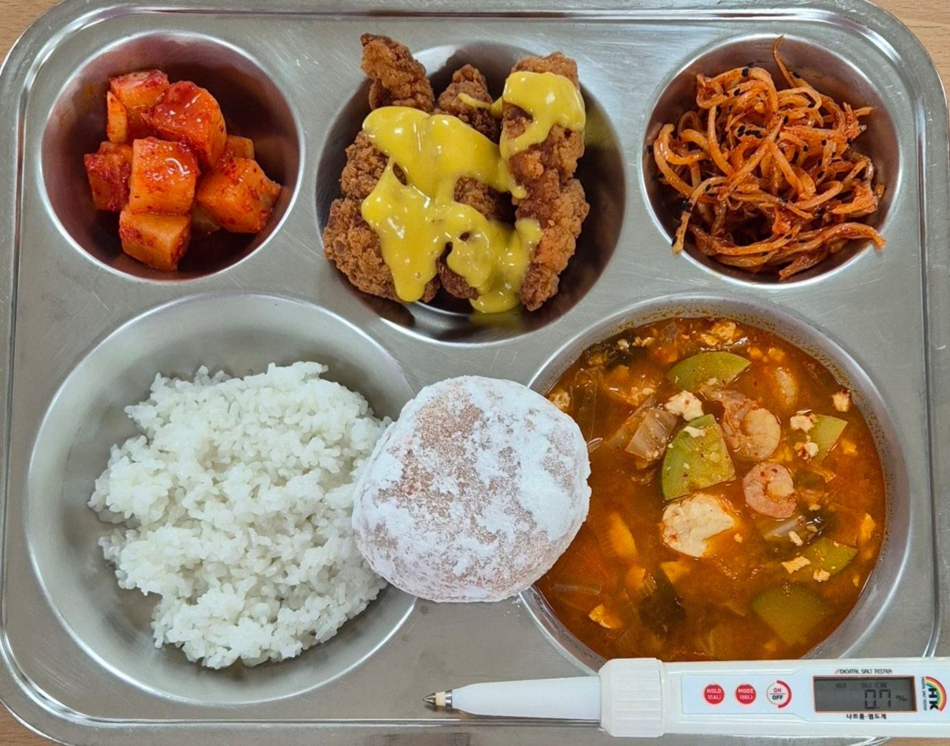 찹쌀밥순두부찌개(5.6.9.13.16)치킨텐더/머스터드소스(1.2.5.6.15)일미도라지무침(5.6.13.17)깍두기(9)미니딸기도넛(1.2.5.6)* 에너지/단백질/칼슘/철720.8/37.8/169.8/2.8