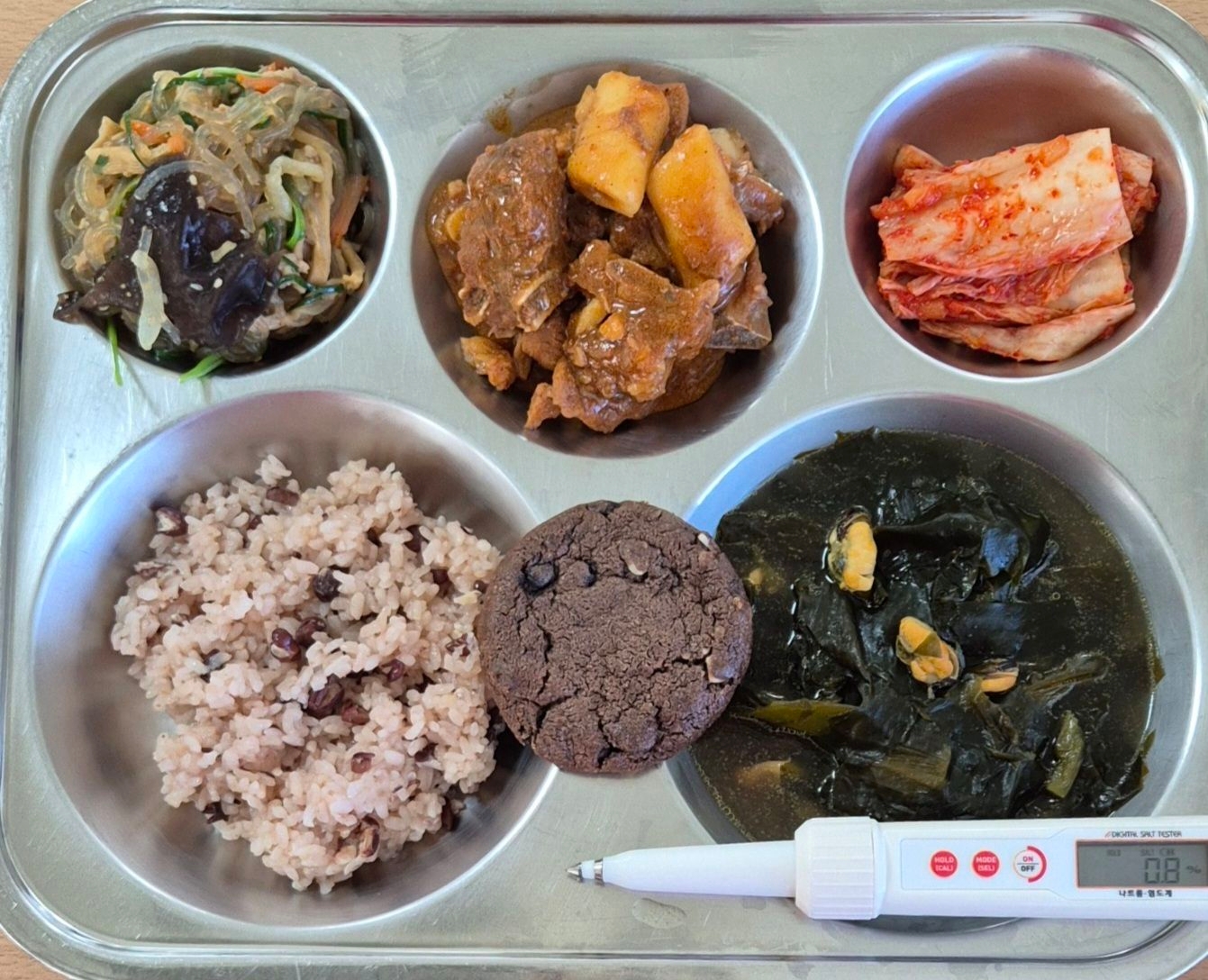 팥찰밥홍합미역국(5.6.9.18)찜갈비(10)한식잡채(1.5.6.10.13)배추김치(9)초코칩쿠키(1.2.5.6)* 에너지/단백질/칼슘/철749.7/30.9/104.8/3.6