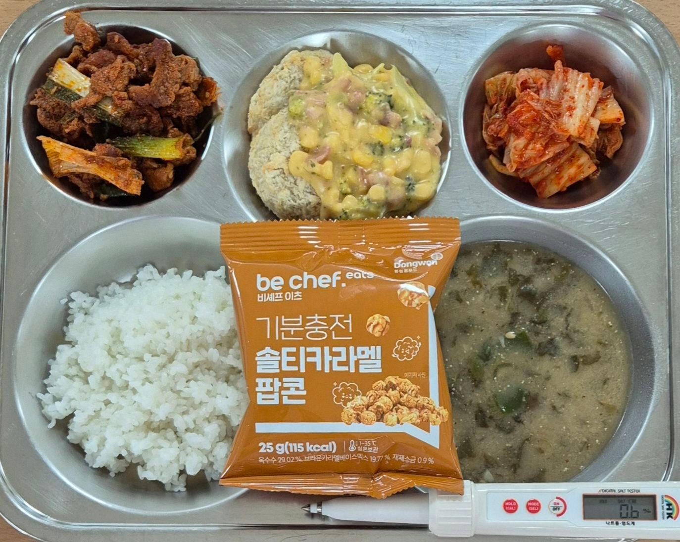 찹쌀밥무청시락국(5.6.9)돈육대파구이(10)치즈감자(1.2.5.6.10.12.13)배추김치(9)솔티카라멜팝콘(2.5)* 에너지/단백질/칼슘/철723.3/36.1/282.8/2.7