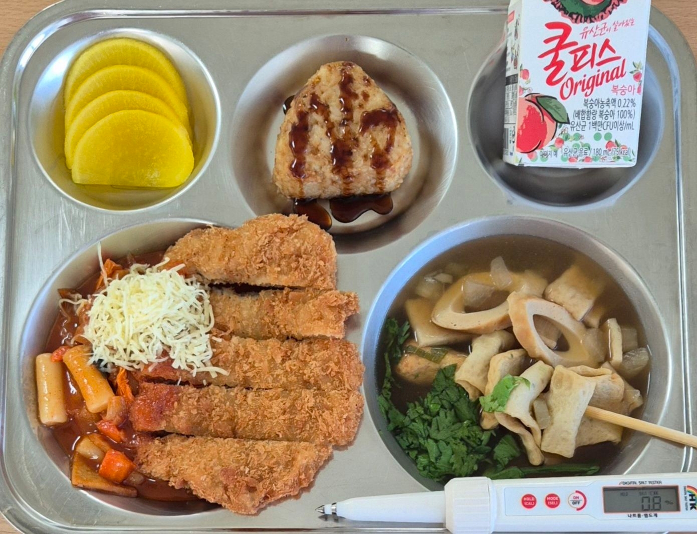 참치마요주먹밥(1.2.5.6.10.13)꼬치어묵국(1.5.6.9)돈가스떡볶이(1.2.5.6.10.13)단무지파인애플주스(13)* 에너지/단백질/칼슘/철702.3/23.1/172.5/5.9
