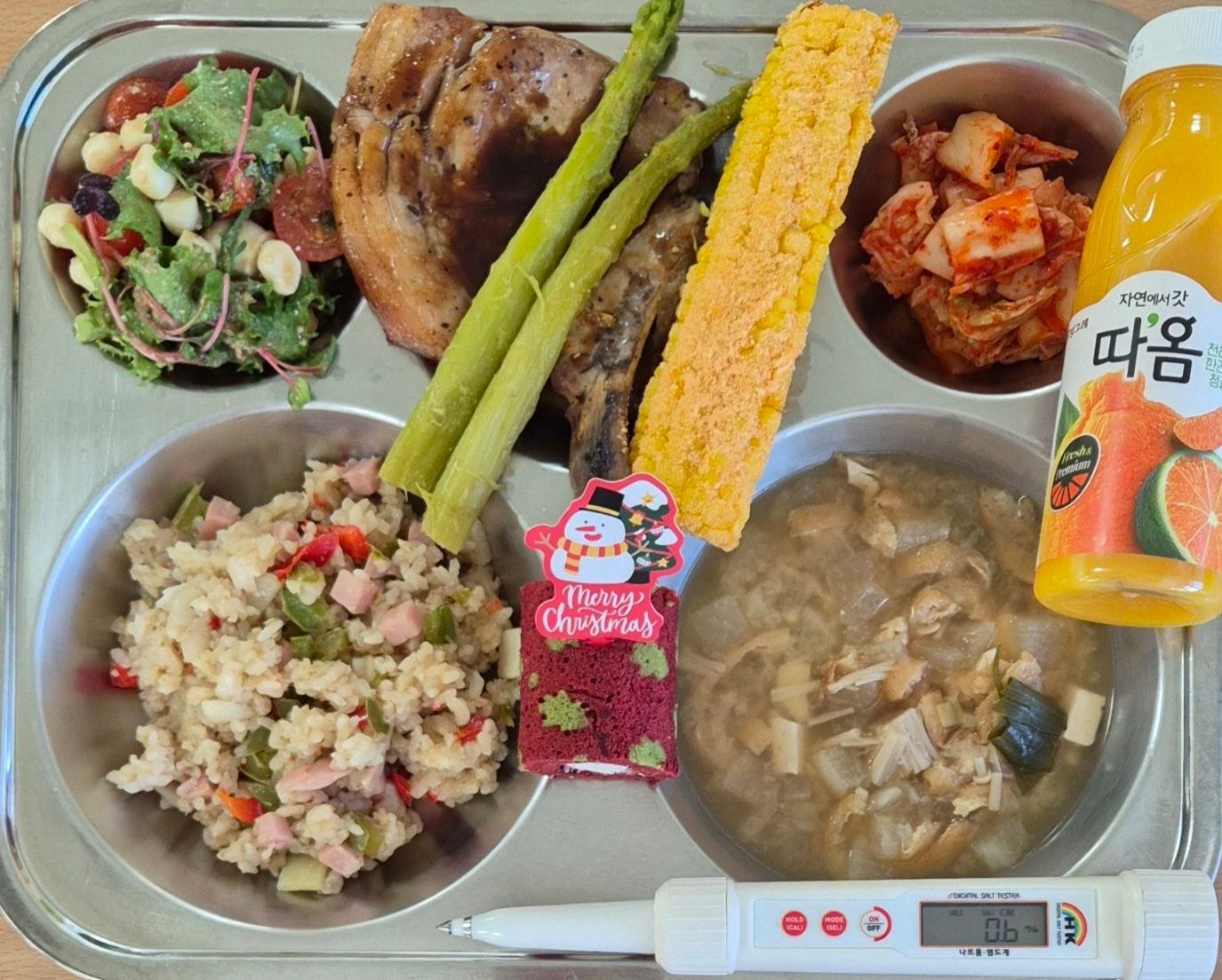 햄야채볶음밥(1.2.5.6.10.13.15.16.18)유부장국(5.6.9)돈마호크/구운야채(2.5.10)토마토치즈샐럿(1.2.5.6.12)배추김치(9)레드롤케이크(1.2.5.6)