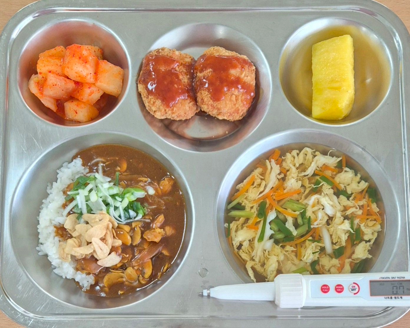일식카레/마늘토핑(1.2.5.6.10.13.16.18)계란실파국(1.5.6.9)멘치볼카츠(1.2.5.6.10.12.13.16.18)깍두기(9)파인애플* 에너지/단백질/칼슘/철746.8/24.6/136.3/3.2