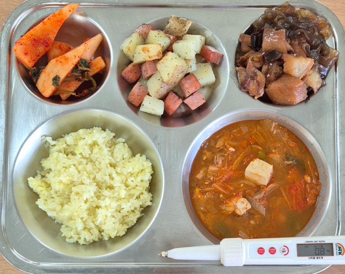 강황쌀밥참치김치찌개(5.9.16.18)봉추찜닭(5.6.13.15.18)감자스팸구이(1.2.5.6.10.13.15.16)알타리김치(9)* 에너지/단백질/칼슘/철718.0/31.5/119.6/2.8