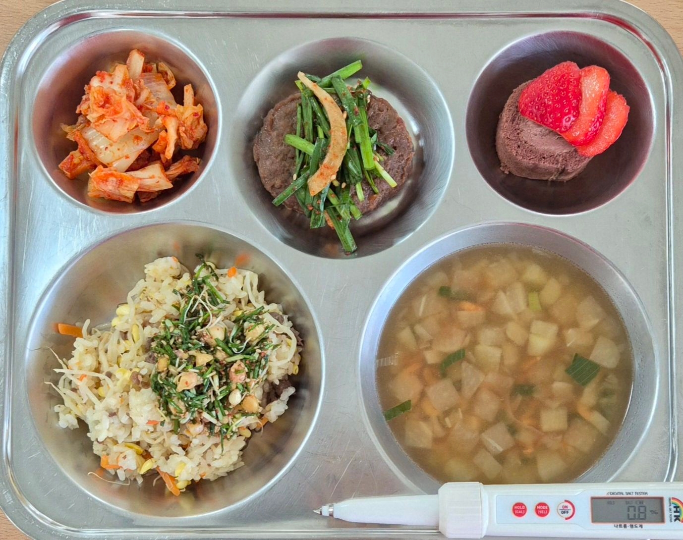 콩나물밥/달래양념장(5.6.16)건새우무국(5.6.9)떡갈비/부추무침(5.6.10.13.15.16)배추김치(9)딸기초코케이크(1.2.5.6)* 에너지/단백질/칼슘/철733.5/25.0/131.0/3.9