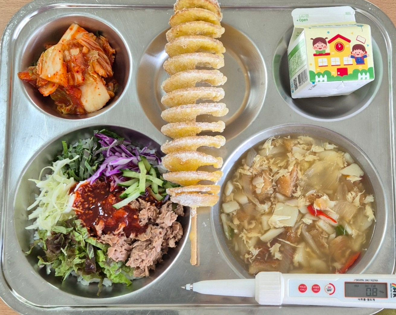참치야채비빔밥(5.6.13.16.18)황태감자국(1.9)회오리감자(5.6)배추김치(9)마시는요거트(사과)(2)* 에너지/단백질/칼슘/철730.9/23.1/157.4/2.0