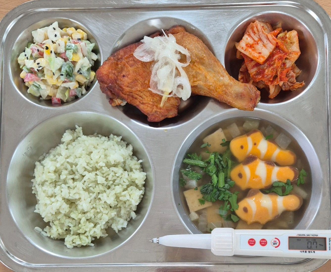 클로렐라쌀밥피쉬볼어묵국(1.5.6.9)탄두리닭다리구이(15)양배추콘샐럿(1.5.13)배추김치(9)* 에너지/단백질/칼슘/철725.7/41.1/93.7/1.9