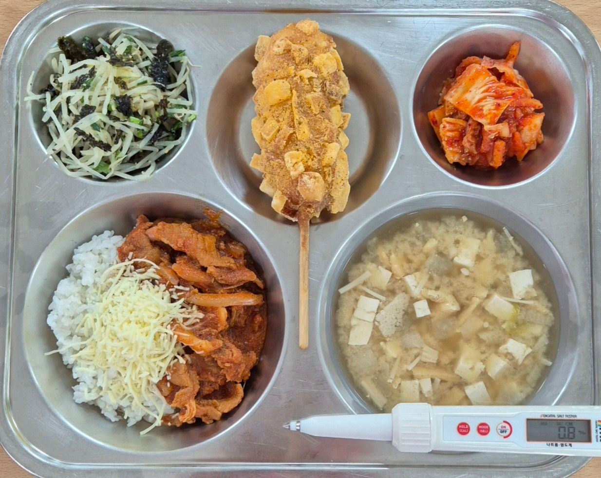 토마토치즈제육덮밥(2.5.6.10.12.13)유부장국(5.6.9)콩나물부추김가루무침(5)배추김치(9)감자모찌핫도그(1.2.5.6.10.16)* 에너지/단백질/칼슘/철720.8/36.8/276.1/3.5