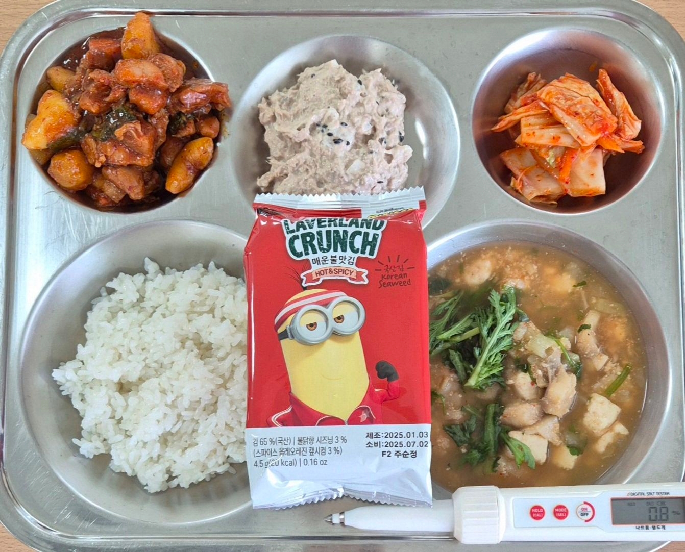 찹쌀밥동태찌개(5.6.9)닭갈비야채볶음(2.5.6.12.13.15.16.18)참치마요샐럿(1.5.16.18)/불닭맛김배추김치(9)* 에너지/단백질/칼슘/철742.7/41.1/132.7/2.3