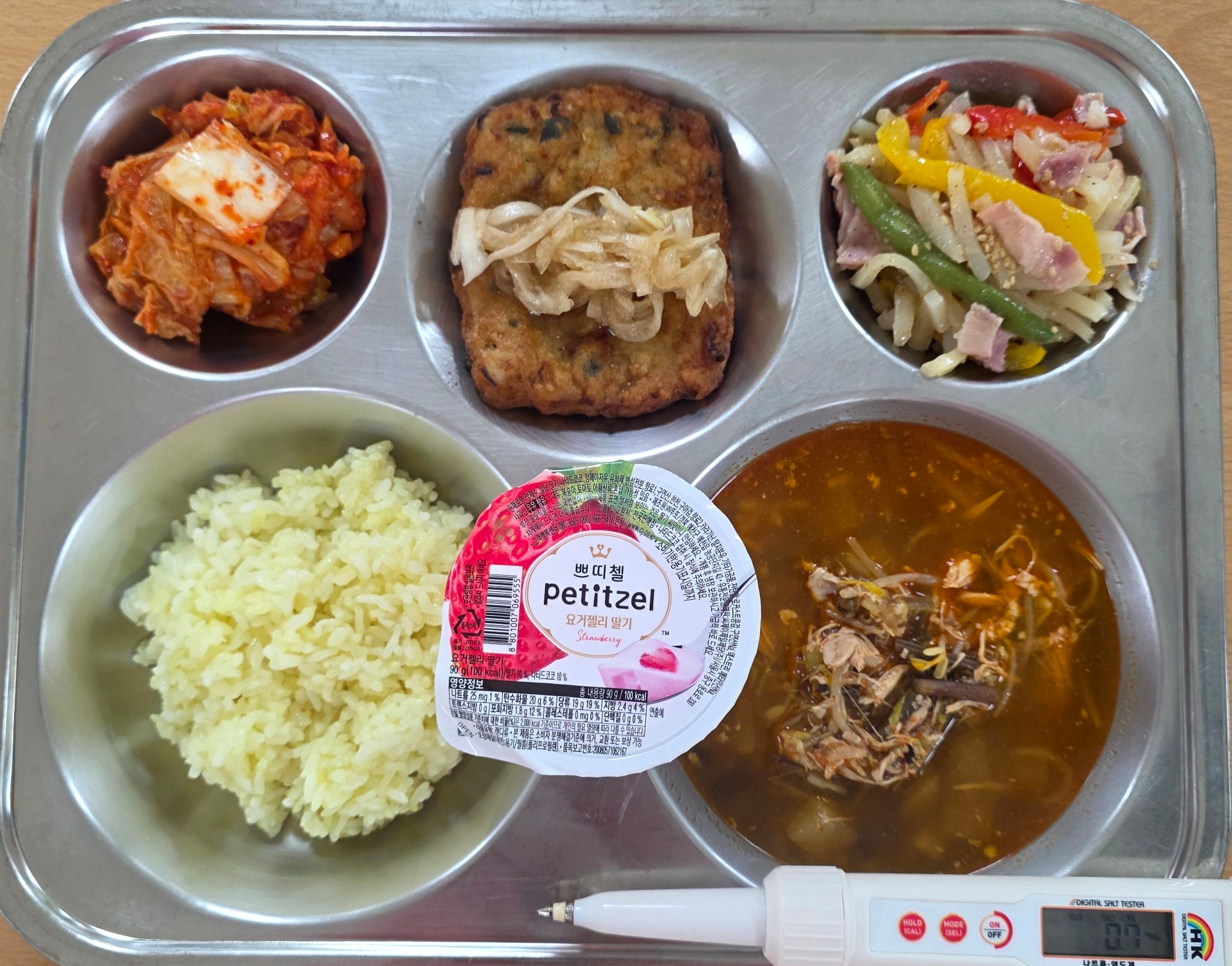 강황쌀밥닭개장(5.6.15)고기완자/양파지(1.2.5.6.10.13.15.16.18)감자채볶음(10.13)배추김치(9)