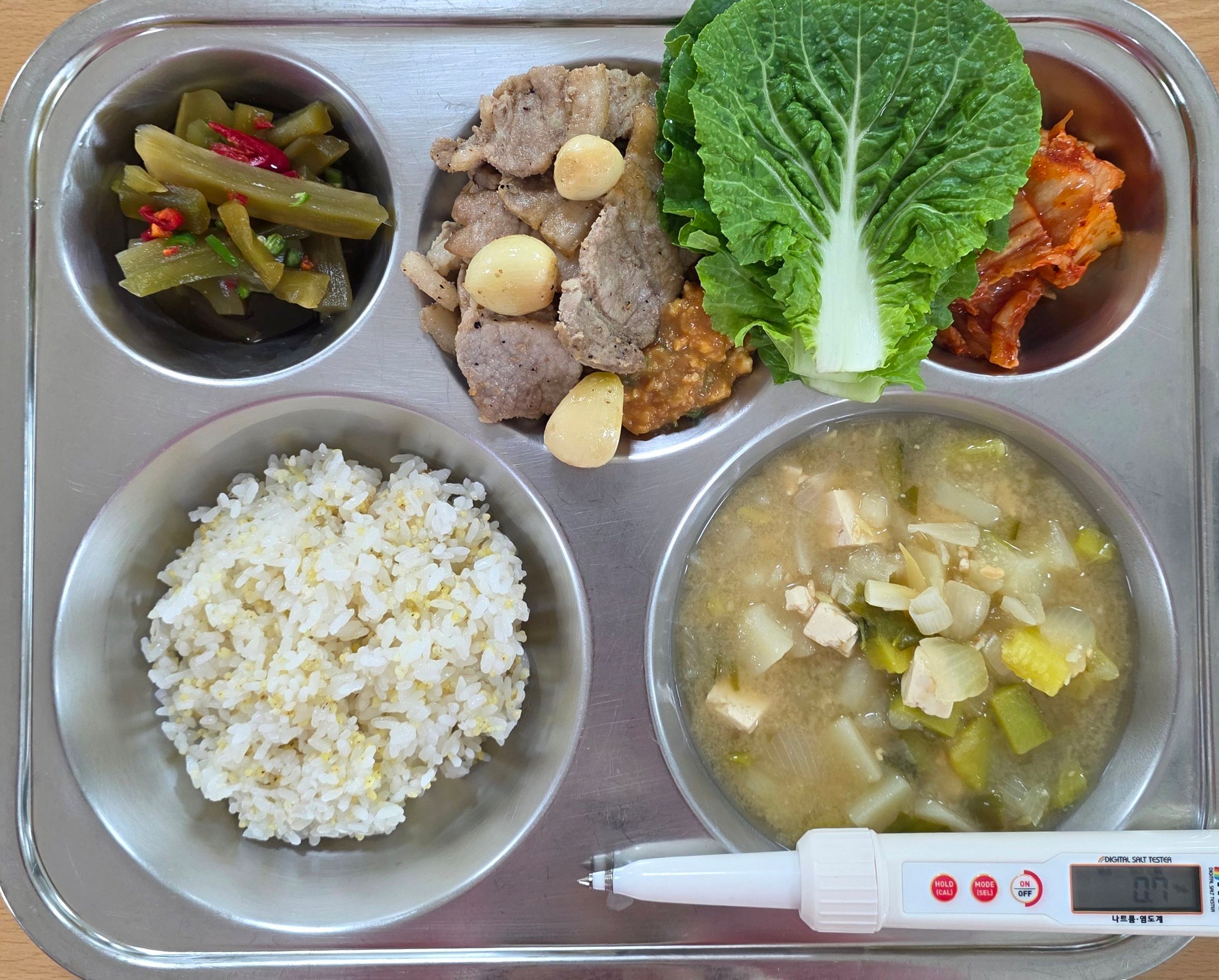 찰기장밥애호박된장국(5.6.9)마늘삼겹살구이(10)쌈추/저염쌈장(4.5.6)궁채장아찌
